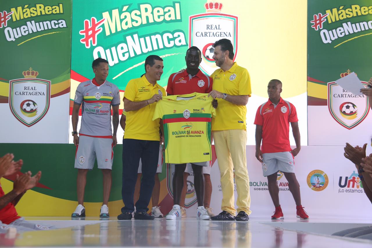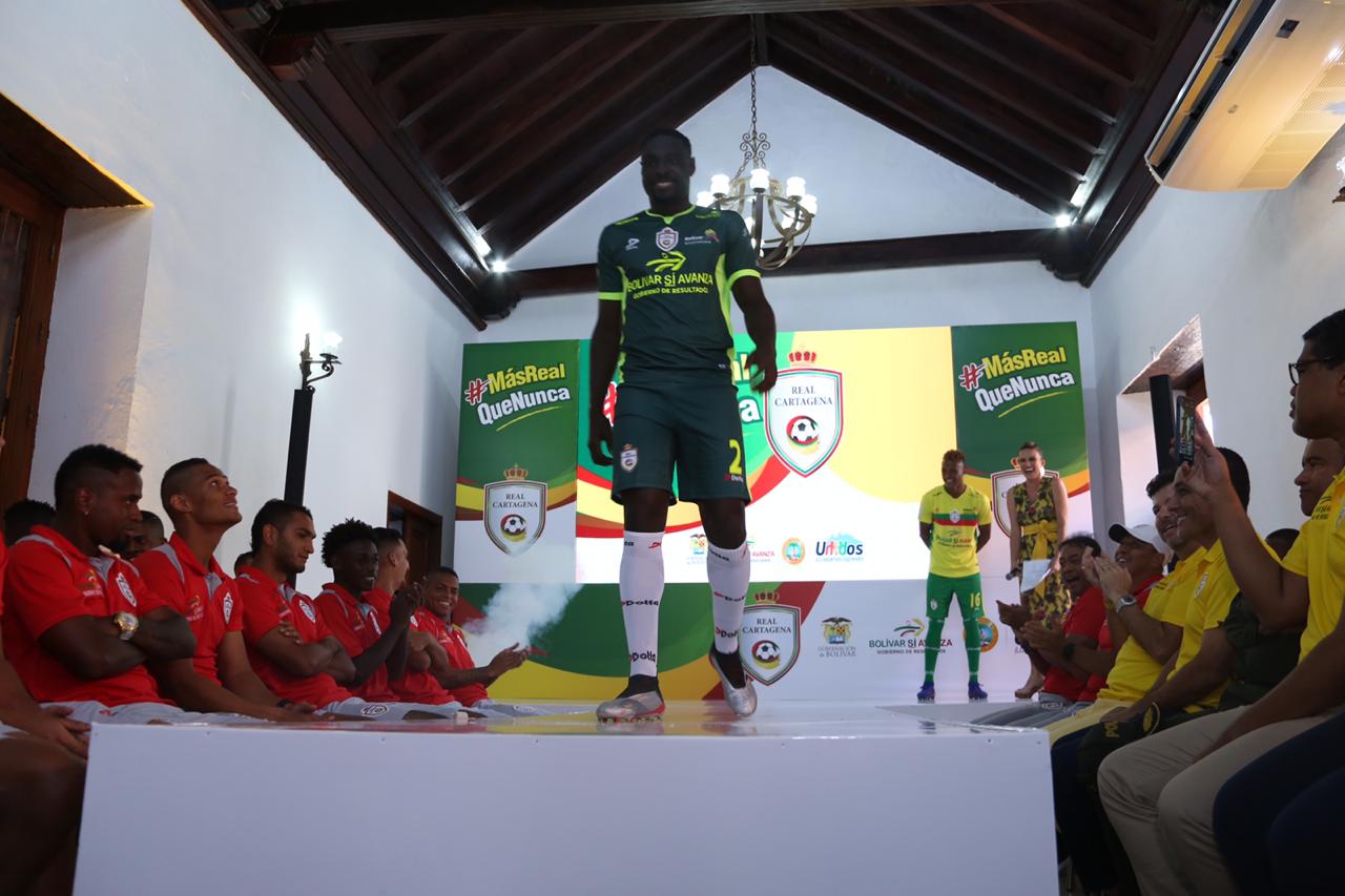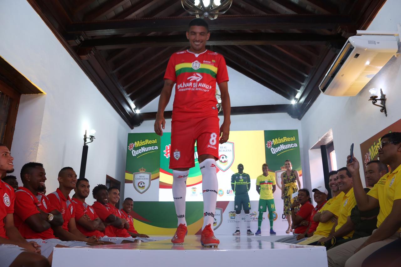 El equipo mostró su uniforme que cuenta con la siguiente variante: Camiseta amarilla franja verde y roja a la altura del pecho, escudo del Real Cartagena al centro de la camiseta y logo de la Gobernación de Bolívar y eslogan “Bolívar Si Avanza, Gobierno de Resultados”.